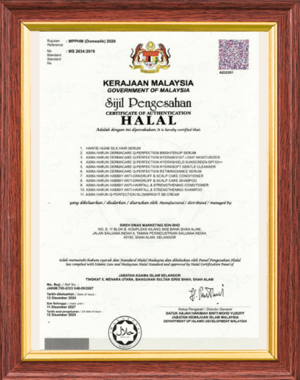 Ya, semua produk kami mempunyai sijil HALAL yang sah dan dihasilkan dengan penuh ketelitian, tanpa alkohol, bahan najis atau meragukan.